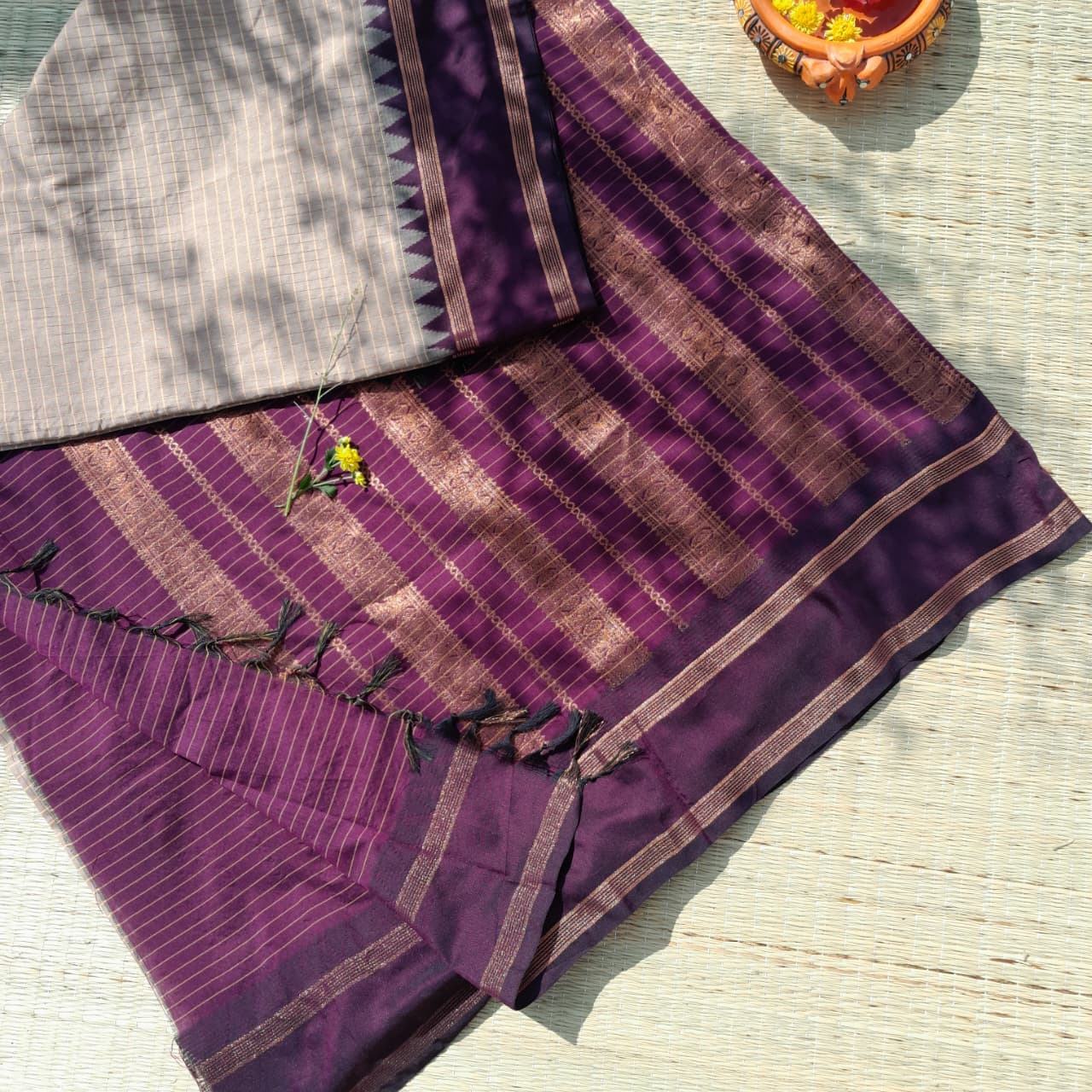 Aval Paavai - Naayagi is a cotton saree rooted in Tamil textile heritage, featuring delicate micro checks woven throughout the body. The signature copper zari embellishments complement the renowned uruvam illa retta petta border connected to the body with korvai technique—a distinctive weaving pattern that reflects authentic South Indian craftsmanship. Pre-tasseled pallu detailing adds traditional elegance, making this piece a statement of cultural pride. Perfect for those who appreciate vintage aesthetics and ethnic authenticity, this saree bridges generations of Tamil weaving excellence with contemporary sensibility.