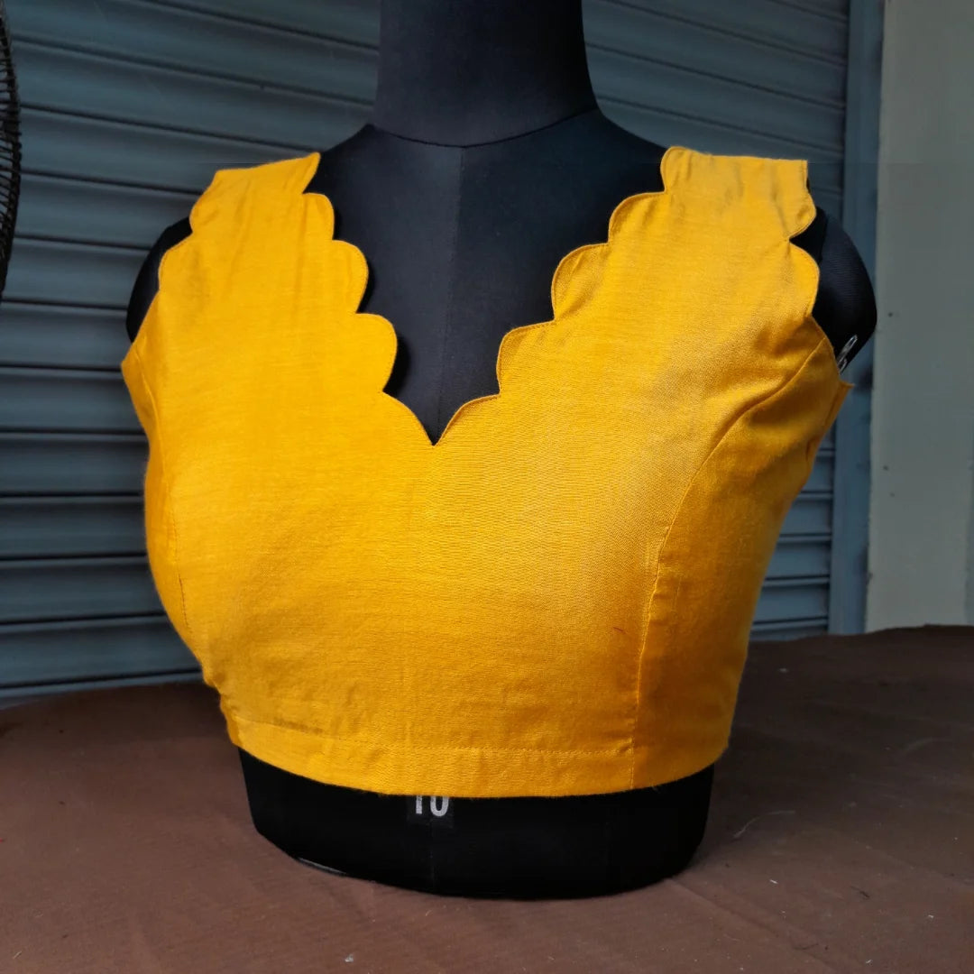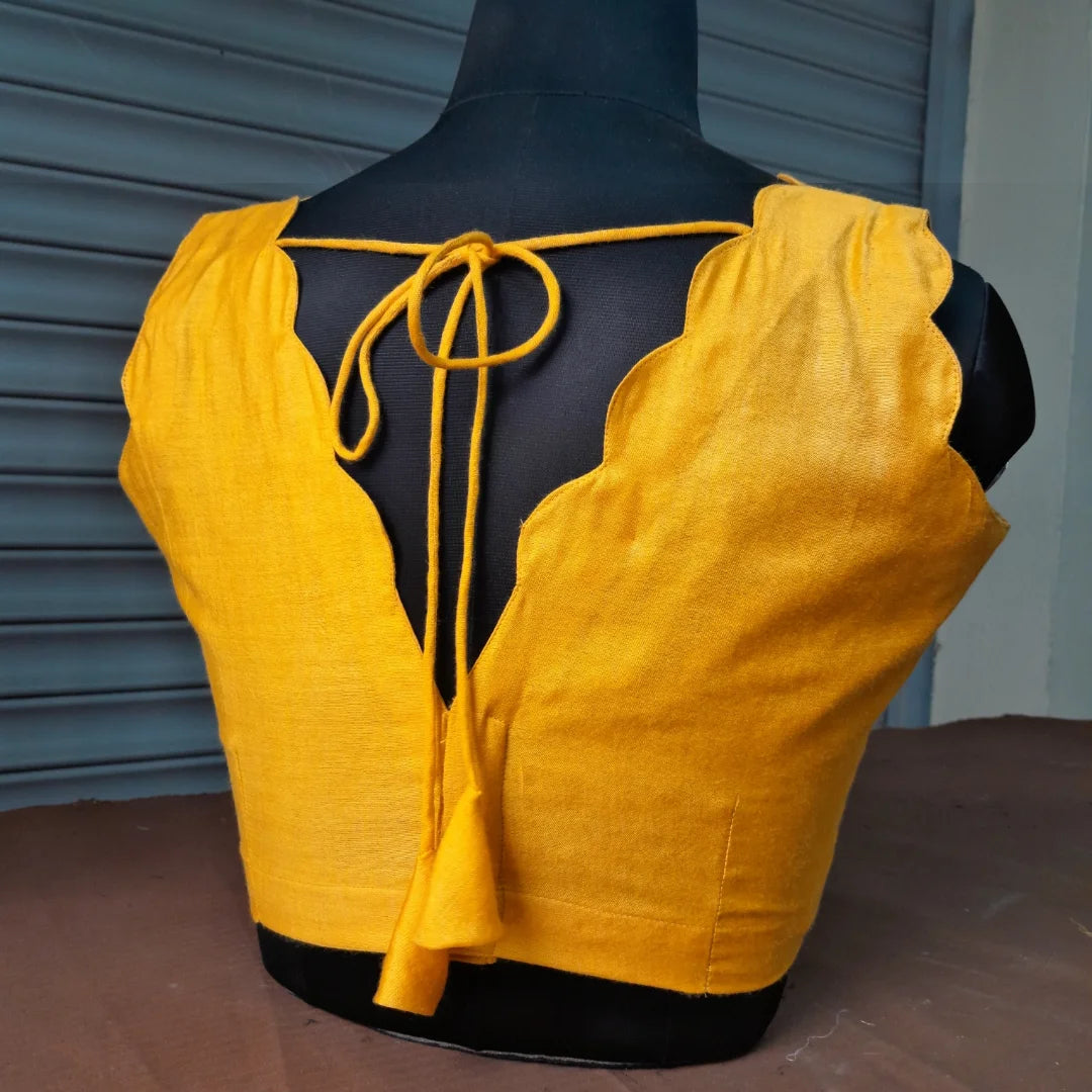 Design: Sleeveless blouse with scallop traced on narrow "V" neckline. Added with Head turning armhole scallop detailing and classic rope n tassles back closure.